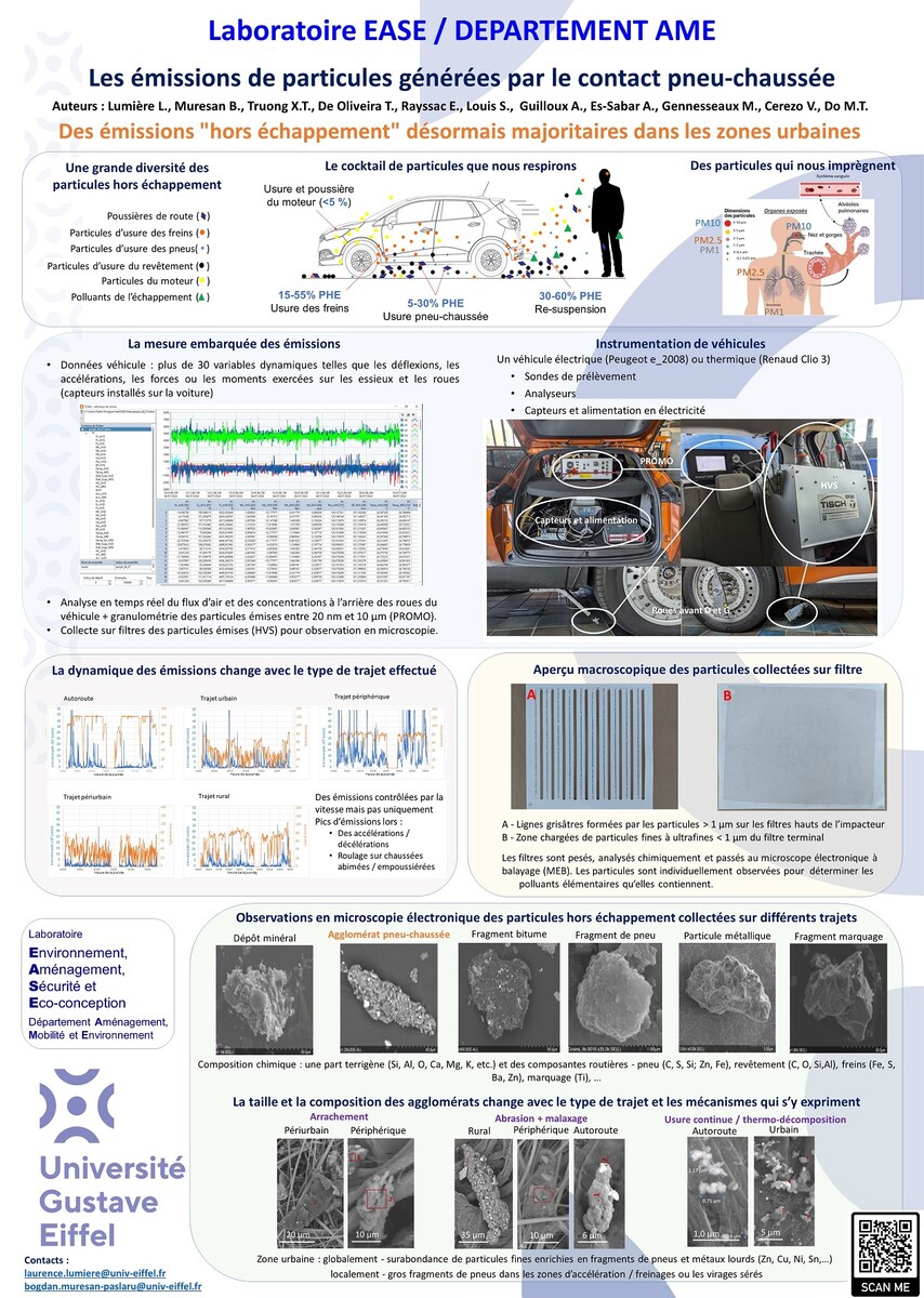 Enfin, la caractérisation et le devenir de ces émissions de particules dues au trafic alimenteront les travaux sur l’adhérence des chaussées routières contaminées. En effet, l’étude du devenir des particules émises permettra de mieux connaitre et caractériser les contaminants générés par le trafic qui se retrouvent sur la chaussée. Or, la compréhension fine des phénomènes physiques se produisant au niveau de l’interface pneu/chaussée est essentielle à l’estimation de la dégradation du niveau d’adhérence induite.