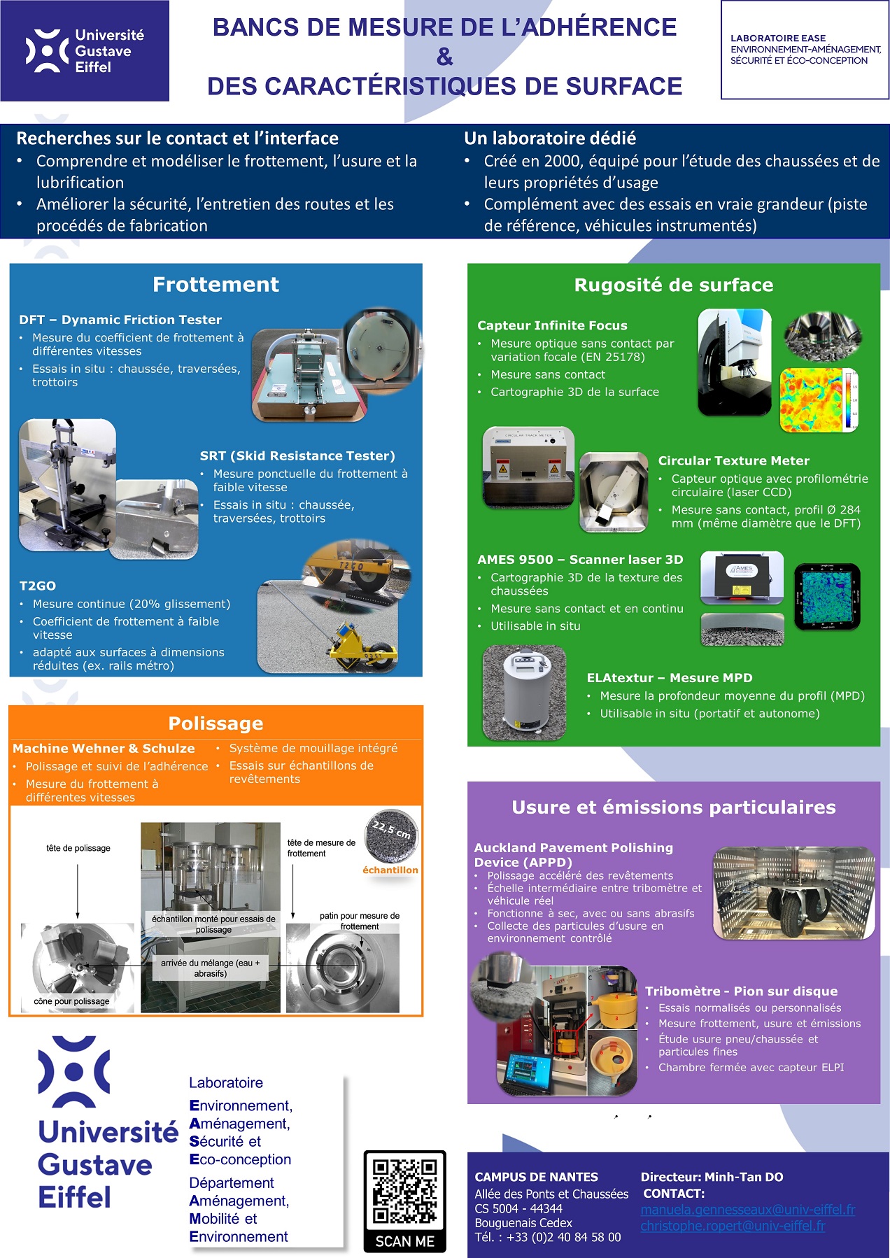 Les recherches sur l’adhérence ont pour objectif de comprendre et modéliser, à partir des expérimentations, les phénomènes de contact (frottement, usure, lubrification) pour des applications visant à améliorer la sécurité des personnes. Elles aborderont la question du contact pneu/chaussée contaminée, avec une ouverture vers des pistes aéronautiques et du contact pneu/rail pour des transports urbains. Le terme contamination couvre l’ensemble des éléments perturbant le contact direct entre le pneumatique et la chaussée. A ce titre, elle englobe l’eau, la neige, le verglas ainsi que l’ensemble des particules qui se déposent sur la chaussée.
